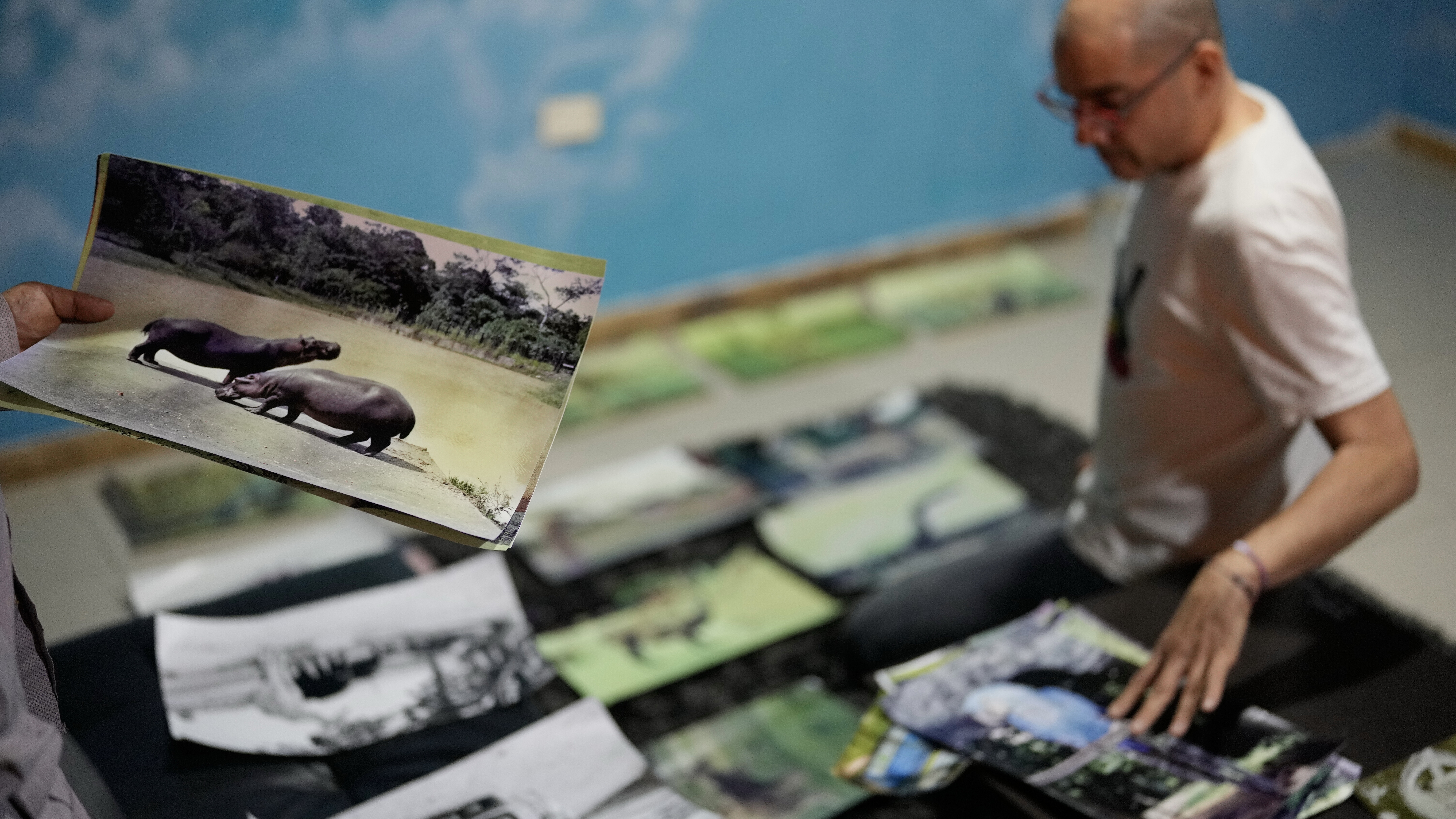 يتجول المصور الكولومبي إدغار خيمينيز في غرفة تعرض عمله الفني "آدم وحواء"، وهي صورة لاثنين من أول أفراس النهر التي جلبها زعيم المخدرات الراحل بابلو إسكوبار إلى كولومبيا في الثمانينيات.