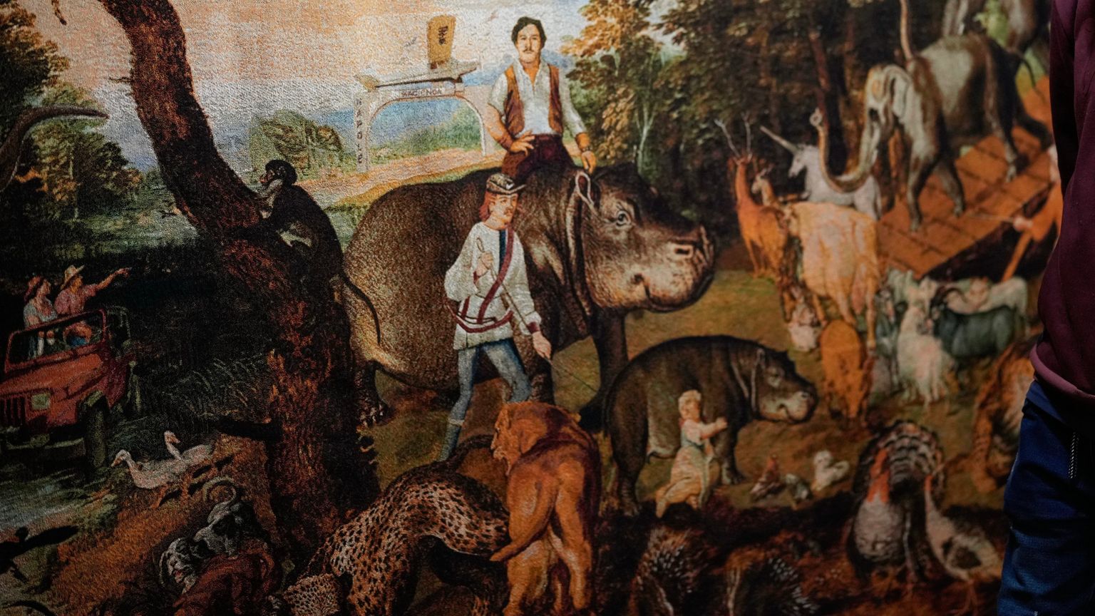 وأشار رويدا إلى لوحة للفنان كارلوس كاسترو كمثال رئيسي، حيث تصور إسكوبار مع الحيوانات البرية وهي تنزل اثنين اثنين من طائرة عسكرية كبيرة، في إشارة إلى سفينة نوح. وأوضح رويدا أن العمل يُدعى "السفينة الكبرى للمهربين"، La gran narco arca.