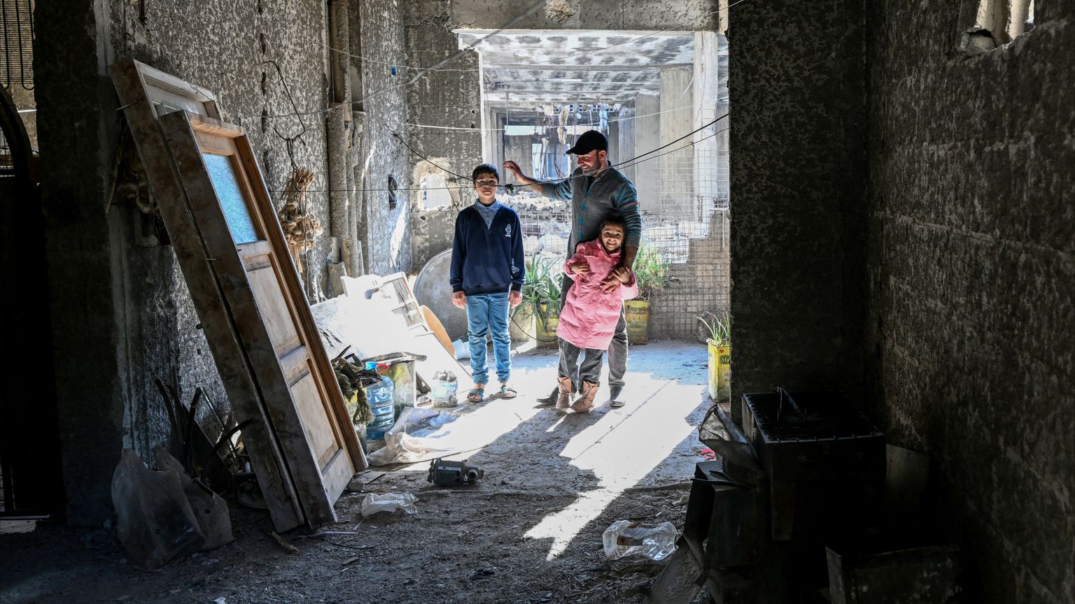 في منزل كفوزي بريف دمشق، جدار خرساني متهالك يكاد يسقط. وعُلّقت ملابس ملونة غسلت حديثا فوق كومة من الأنقاض.