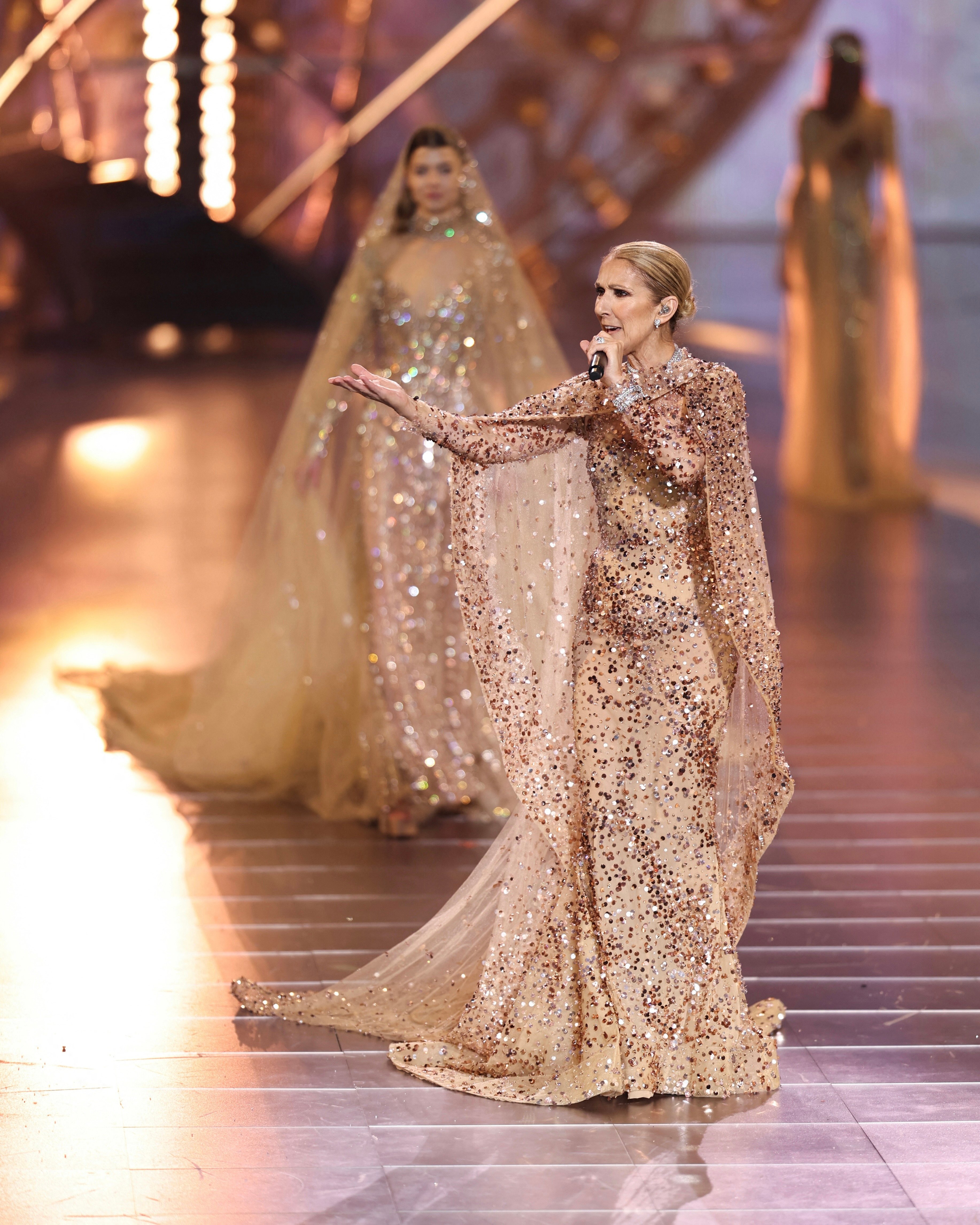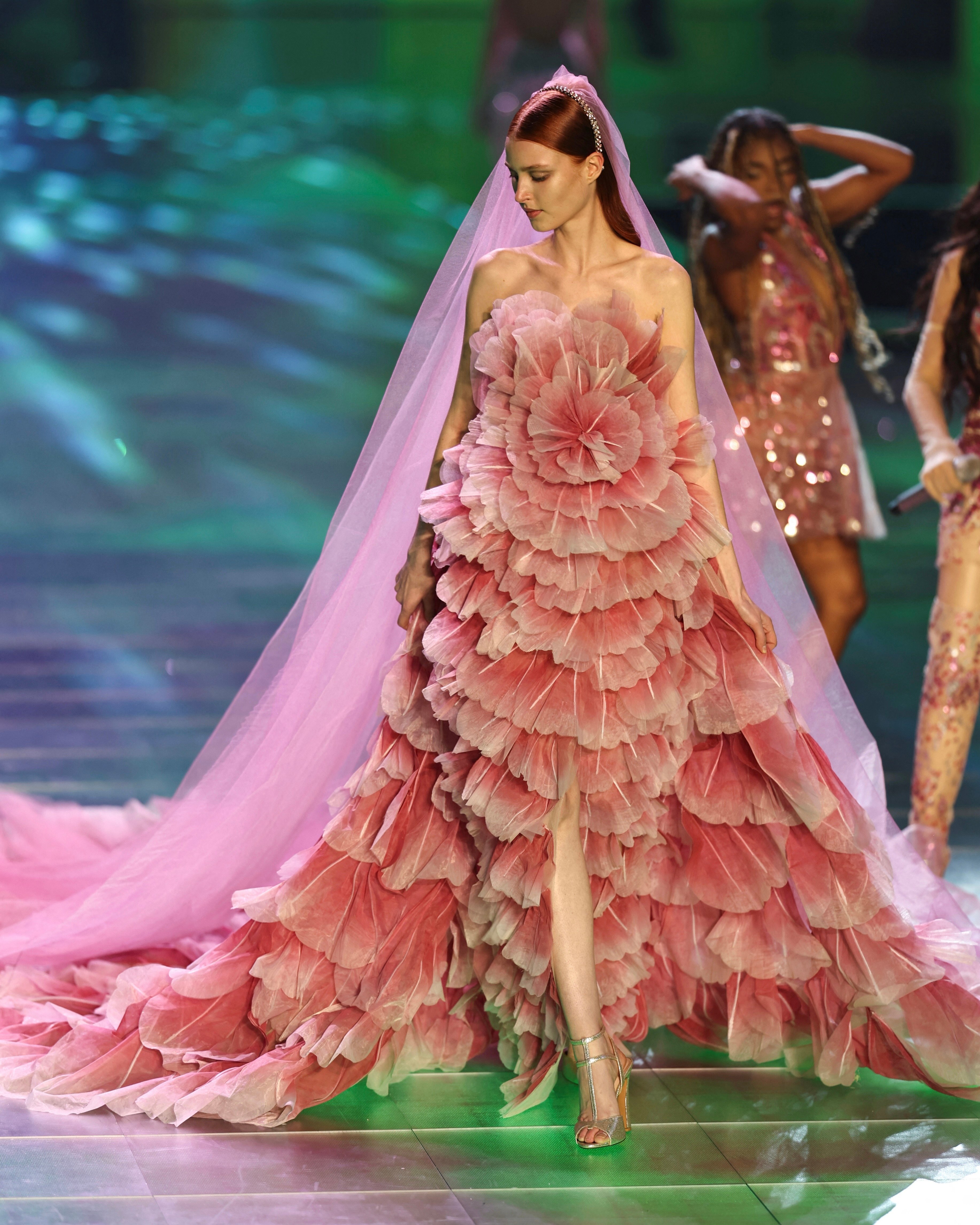 بعد أن جلست بيري في الصف الأمامي، انطلقت العروض الموسيقية، بدءا من جينيفر لوبيز التي نزلت من أعلى مرتدية بدلة مزينة بشراشيب لامعة من تصميم المصمم اللبناني، وارتدت العارضات اللواتي كن يسرن على أنغام لوبيز إطلالات متناسقة مع ريش من عشرينيات القرن العشرين.