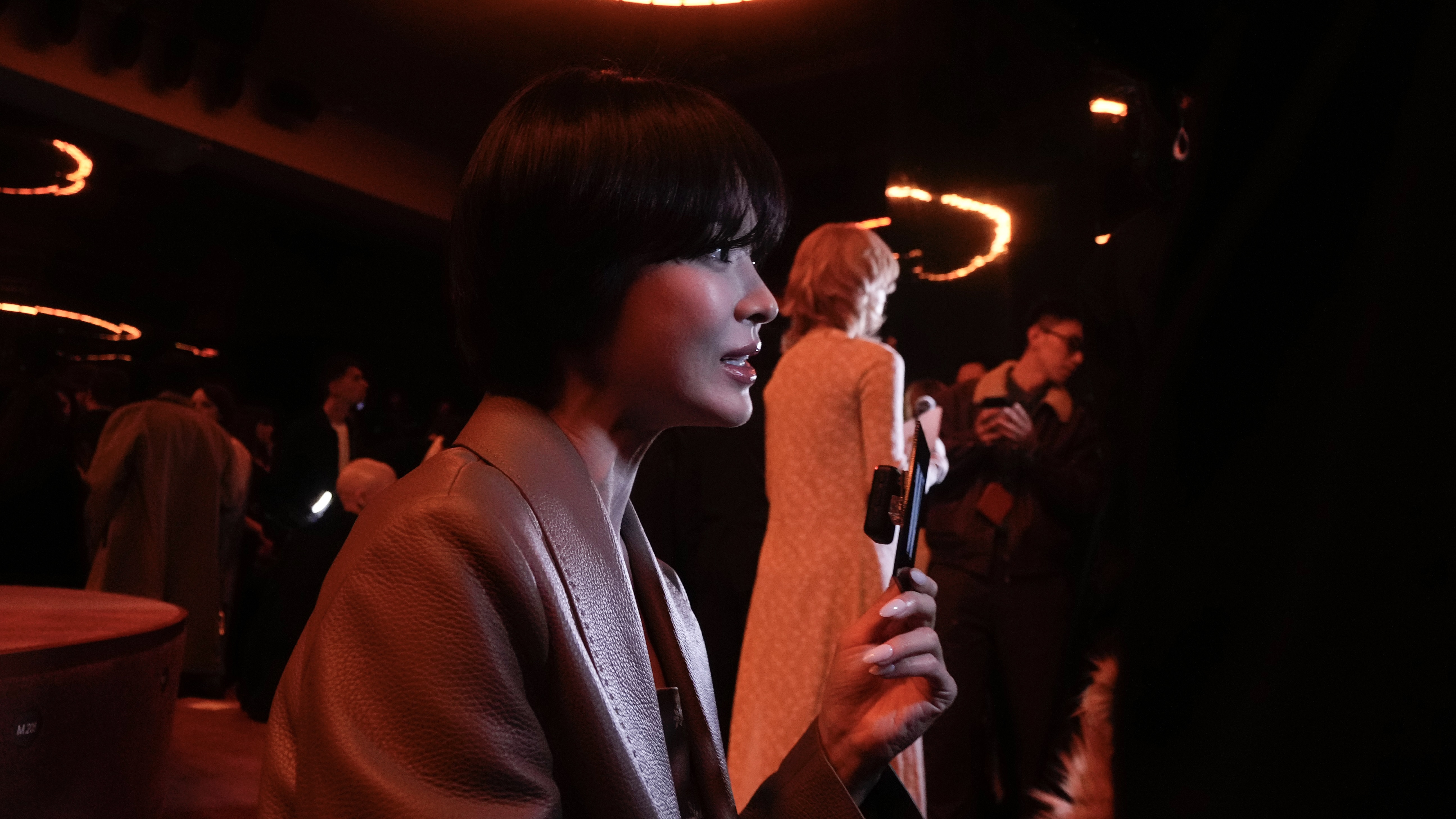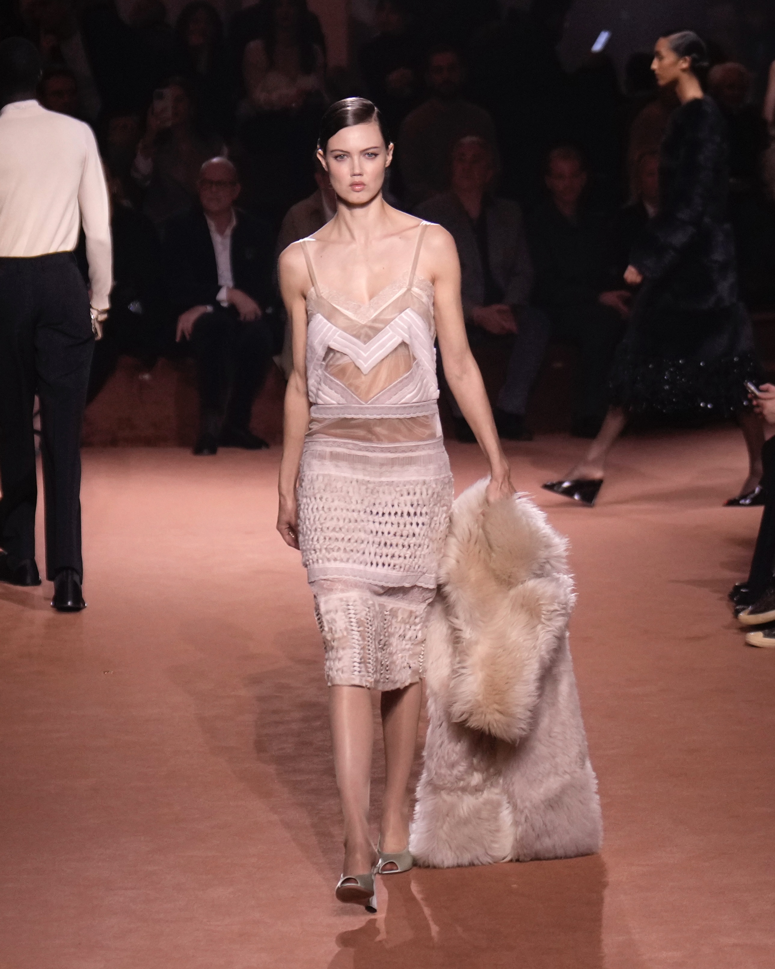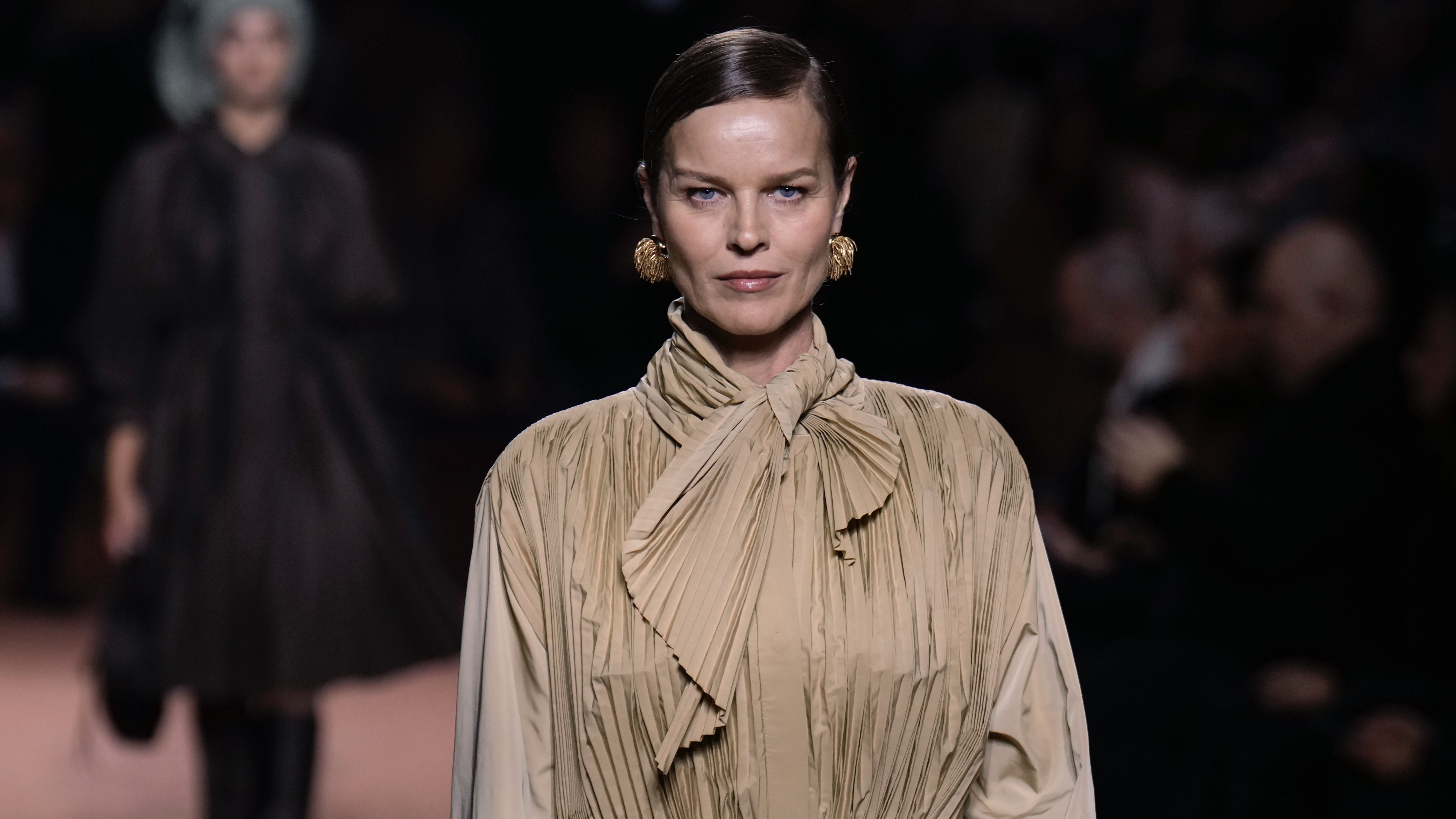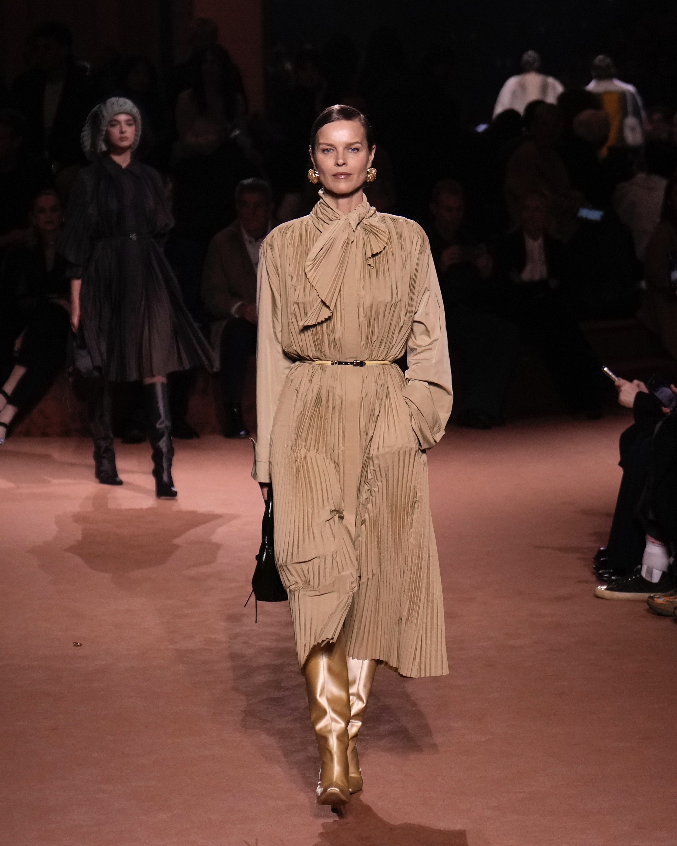 شهد العرض مشاركة أصدقاء قدامى للدار، من بينهم السوبر موديل إيفا هرتزيغوفا التي تألقت بفستان ميدي ذي طيات أكورديون وربطة أنيقة عند العنق.
