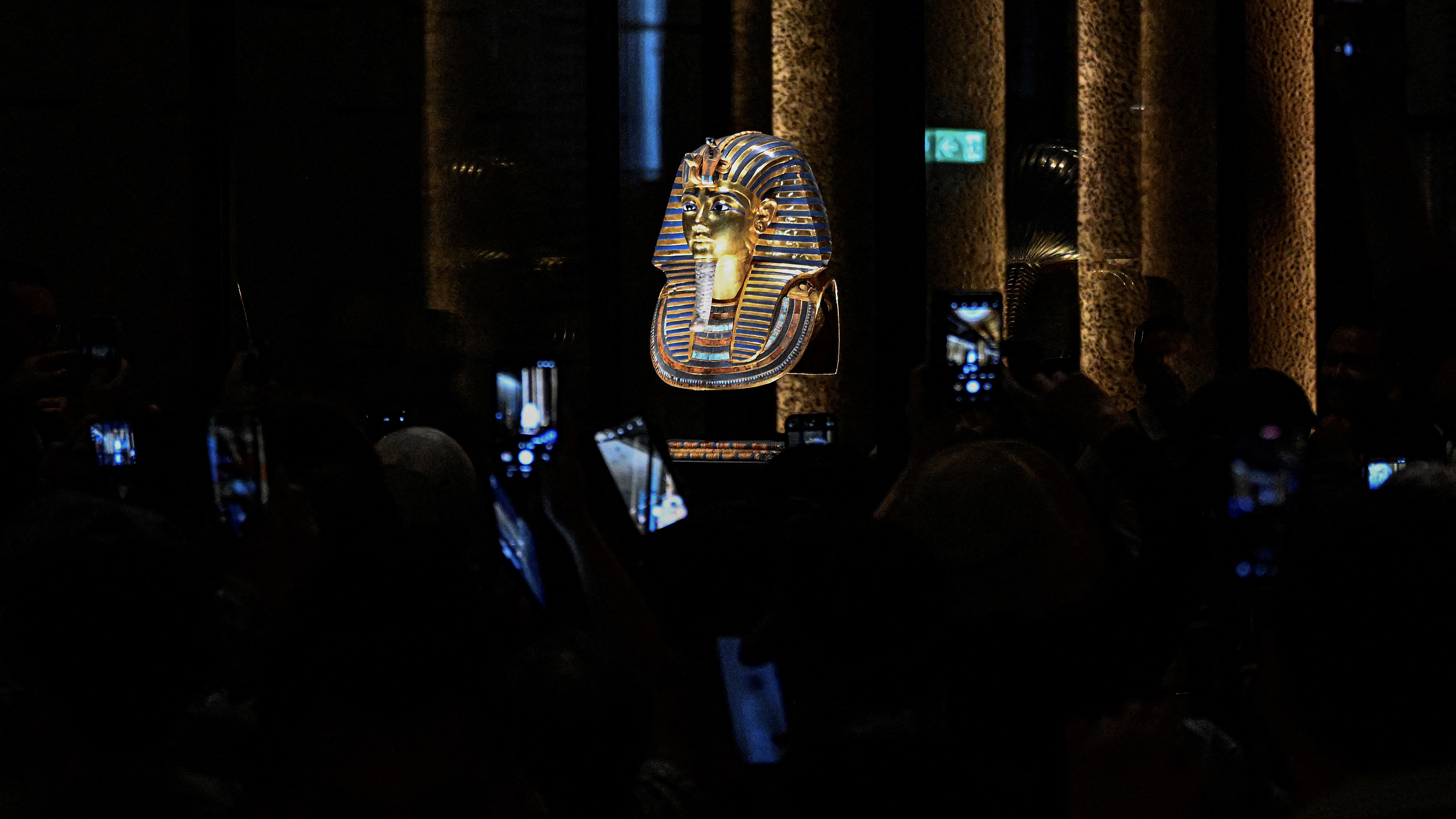 يُعرض القناع الذهبي للملك الذي حكم مصر القديمة قبل أكثر من ثلاثة آلاف عام في منتصف قاعة ضخمة خافتة الإضاءة، محاطا بكنوزه الذهبية التي تضم مقتنيات أسرته وأدوات مذهبة بالإضافة إلى عشرات التماثيل الجنائزية.