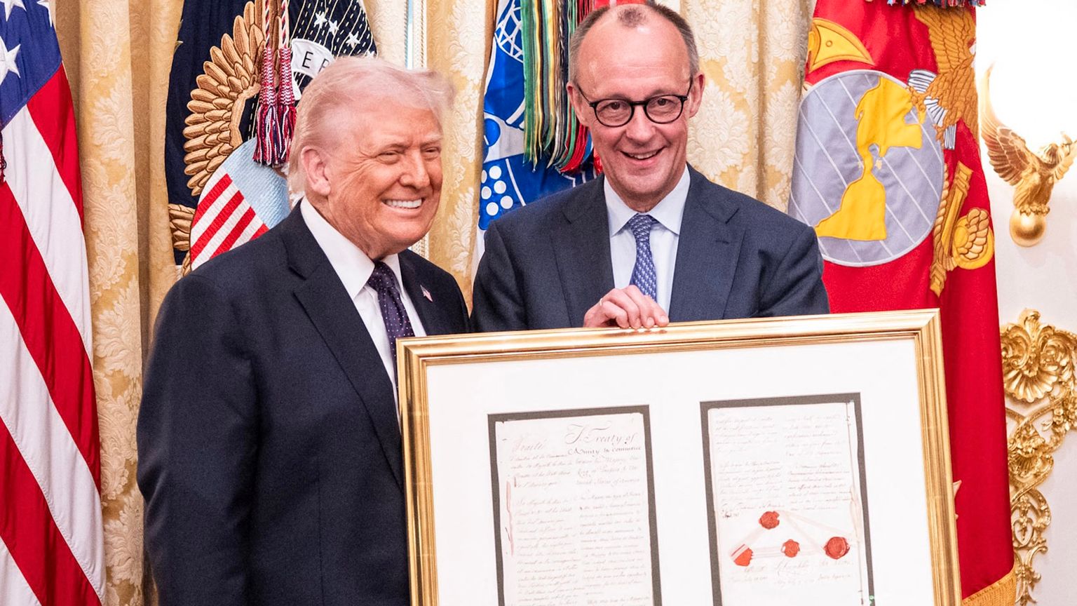 على خلفية النزاع التجاري بين الولايات المتحدة والاتحاد الأوروبي، أهدى المستشار الألماني فريدريش ميرتس الرئيس الأمريكي دونالد ترامب نسخة طبق الأصل من معاهدة الصداقة والتجارة الموقعة عام 1785 بين الولايات المتحدة وبروسيا.