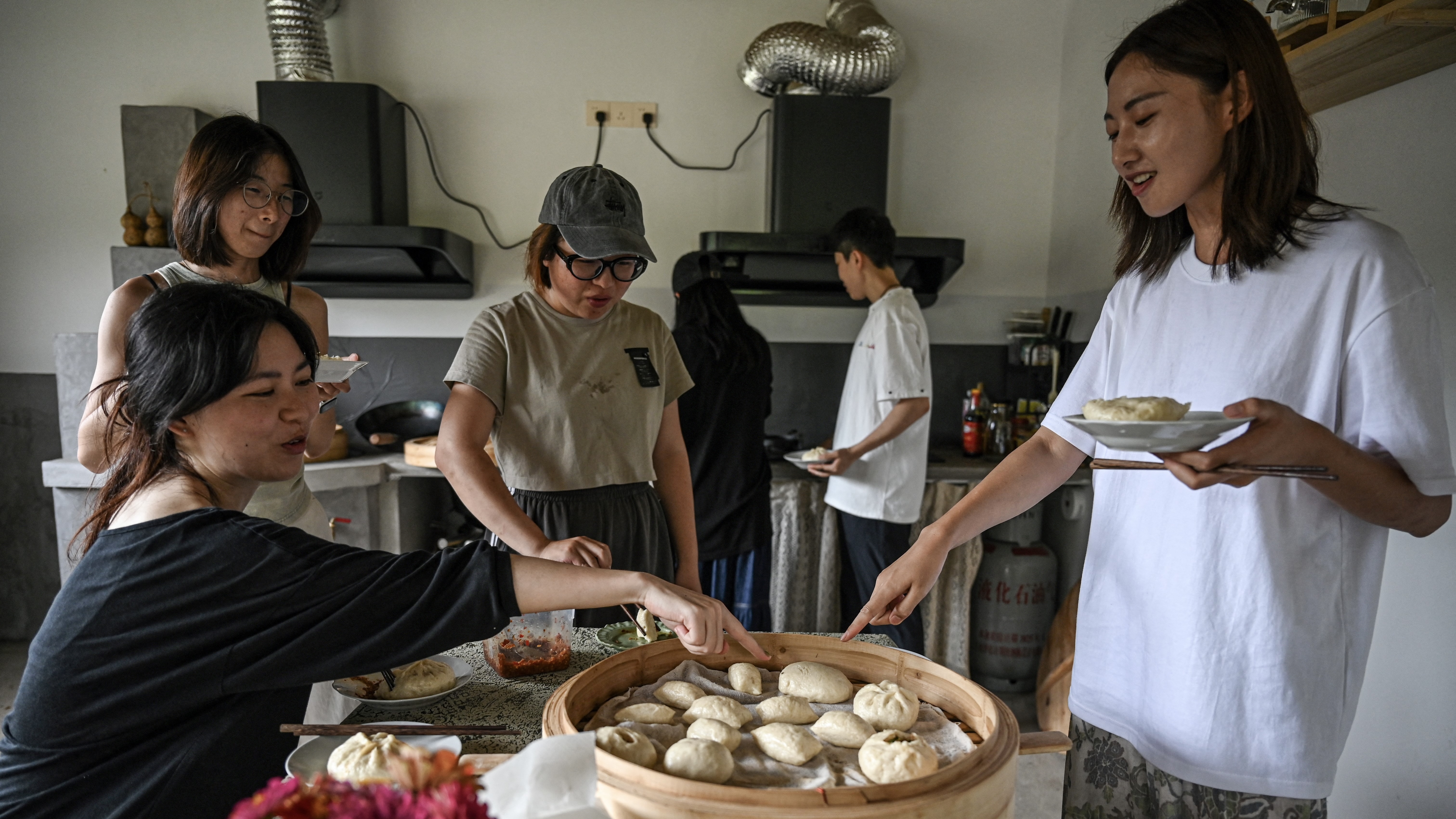 بعد تحضير كعكات اللحم المطهوة على البخار في المطبخ المطل على الجبال، تتجاذب النساء أطراف الحديث في غرفة المعيشة المريحة.