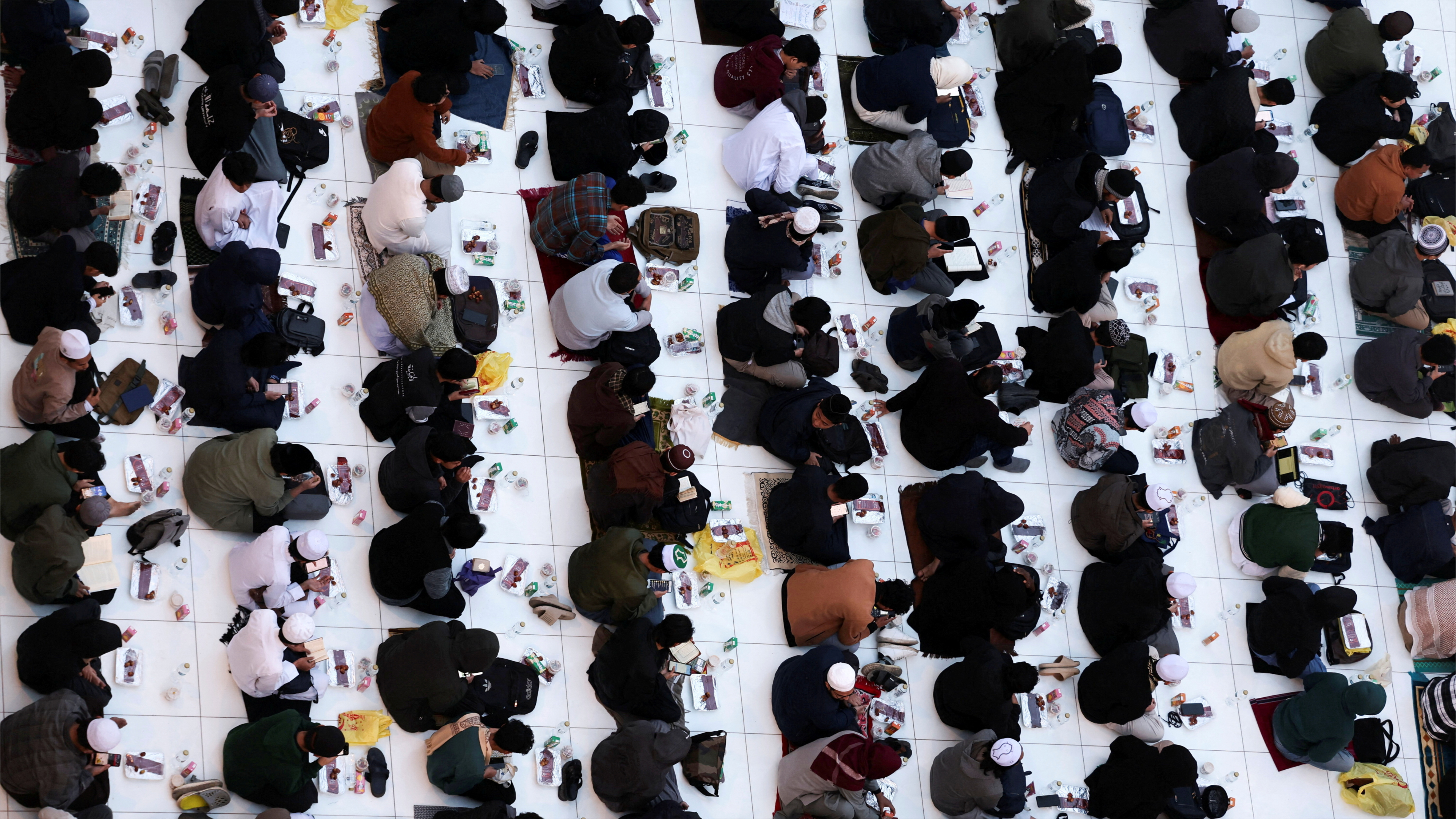 ويتجمع آلاف الطلاب، أغلبهم من الأجانب الذين يدرسون في جامعة الأزهر، في ساحة المسجد لتناول الإفطار.